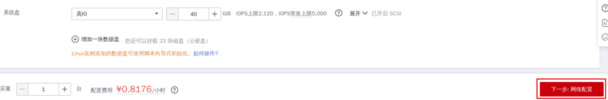 ⑤ 系统盘保持默认的“40GB”,点击“下一步:网络配置”