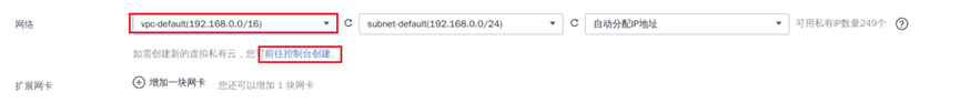 ⑥ 网络选择默认的“vpc-default”,如果之前没有创建,可点击下图所示的“前往控制台创建”,创建完成后,刷新后即可看到: