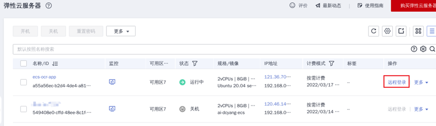 ① 回到ECS控制台,找到刚创建的ECS服务器,点击“远程登录”