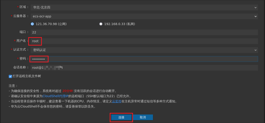 ③ 使用root用户登录,输入密码a3hZJfup%kIrhKT$后,点击“连接”: