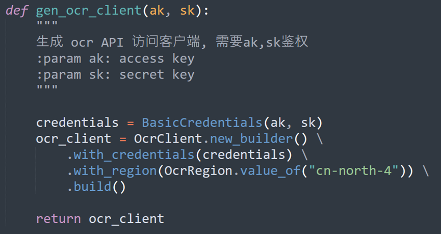 ① 生成OCR请求客户端,需要AK, SK鉴权: