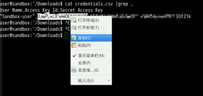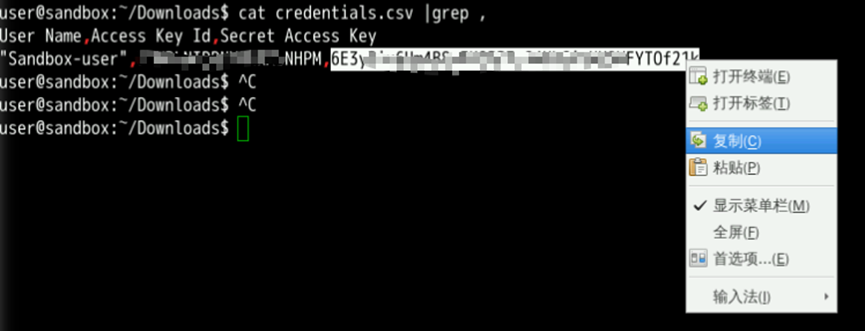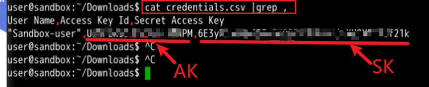 执行cat credentials.csv |grep ,查看AK/SK的值