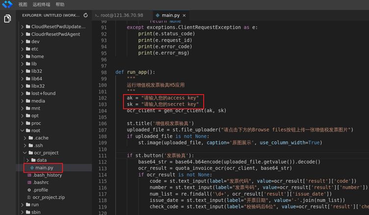 ② 切换到浏览器,进入cloudshell标签页,点击左侧文件浏览器,定位至root/ocr_project/main.py文件,双击main.py,修改代码,复制修改填入上步骤中的AK/SK信息