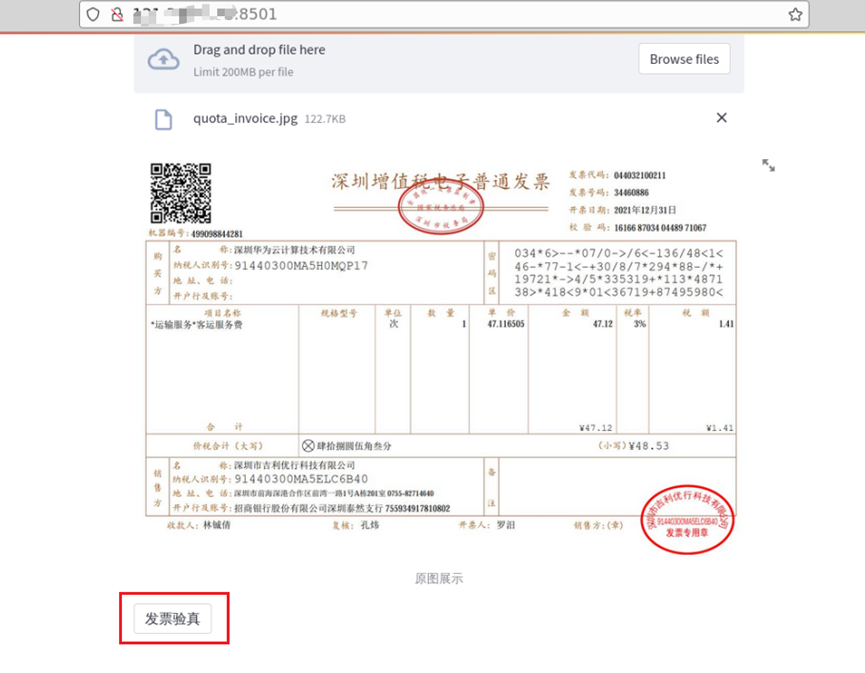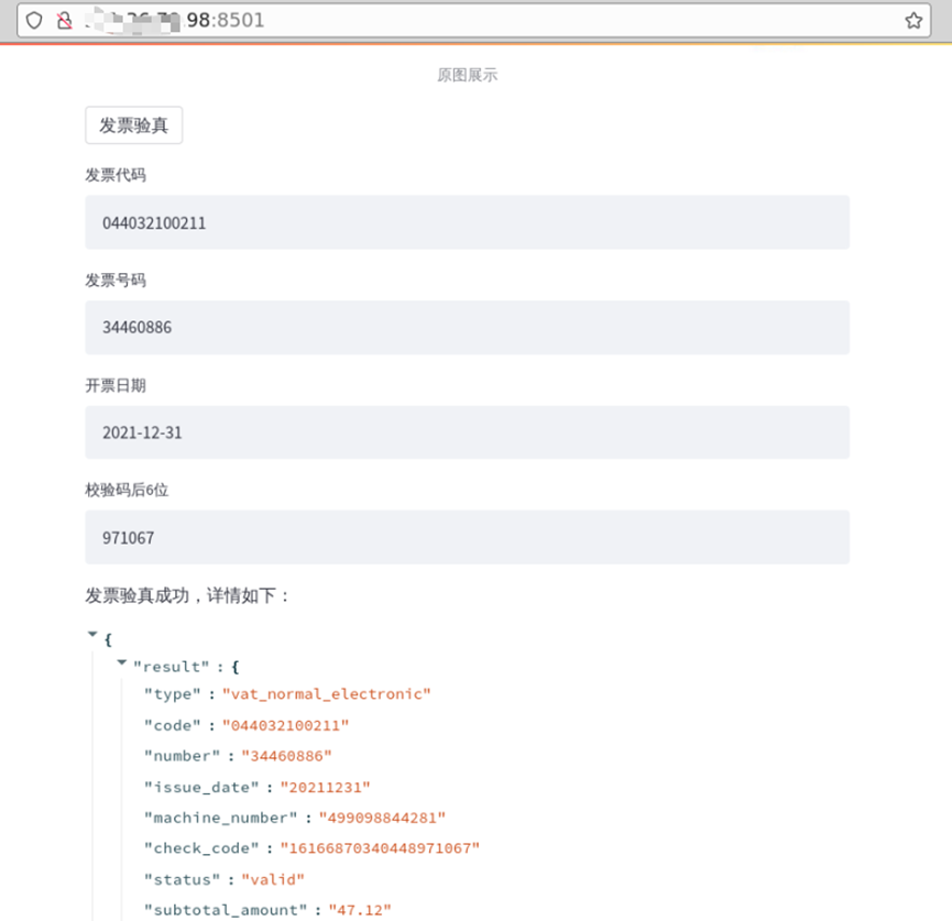 web页面显示发票图像,继续点击“发票验真”按钮: