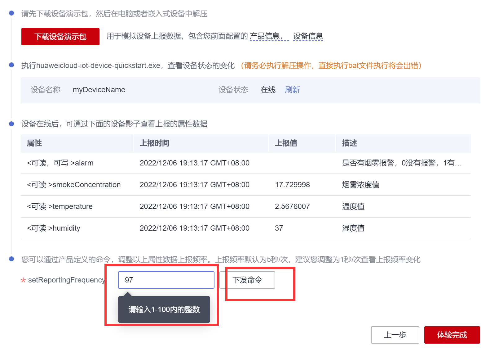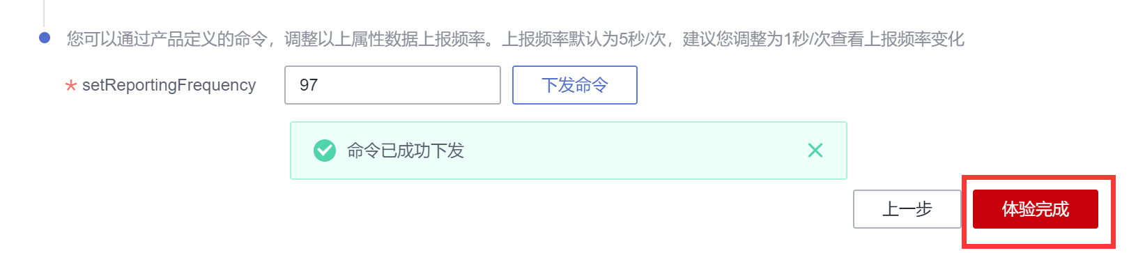 尝试在底部输入1~100的随机数字,点击“下发命令”,即可点击“体验完成”结束任务。