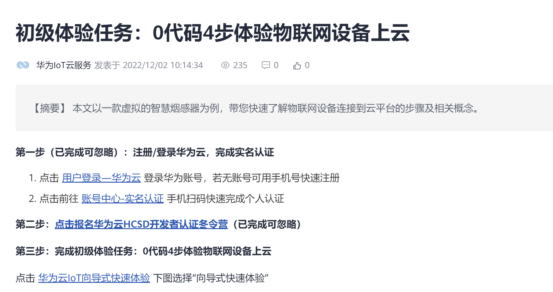冬令营全程测试第一回——【初级体验任务:0代码4步体验物联网设备上云】