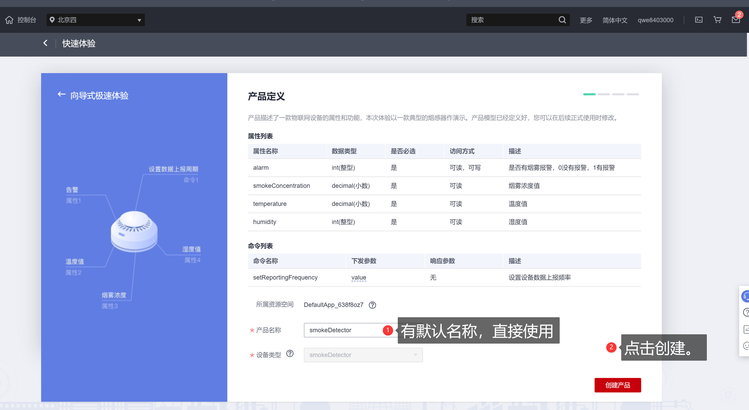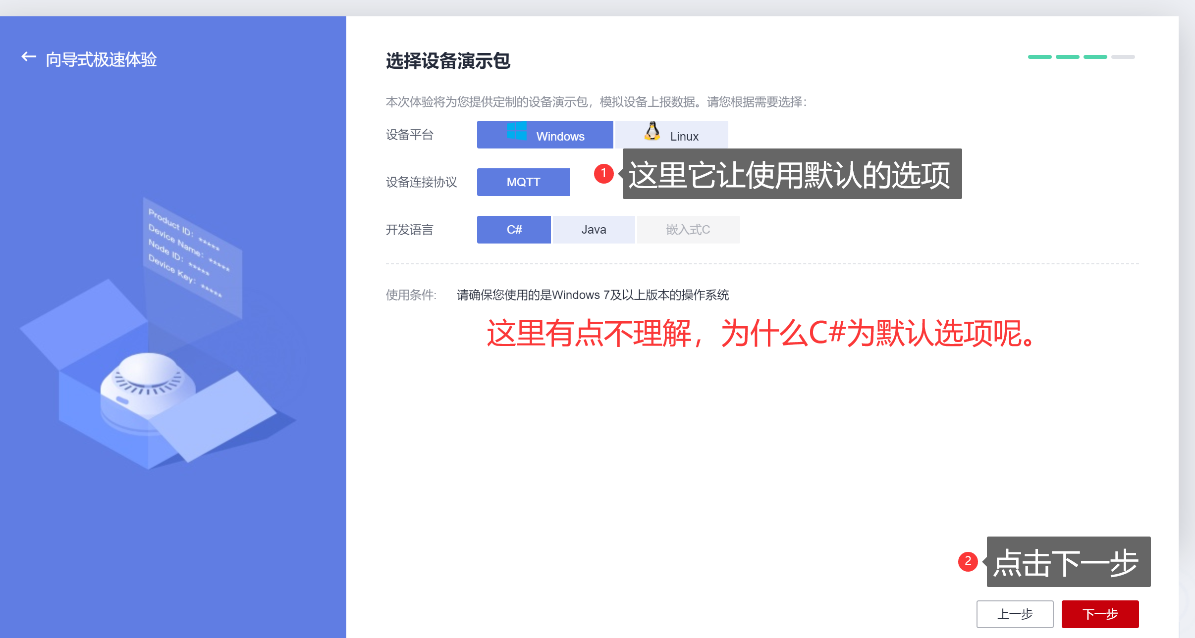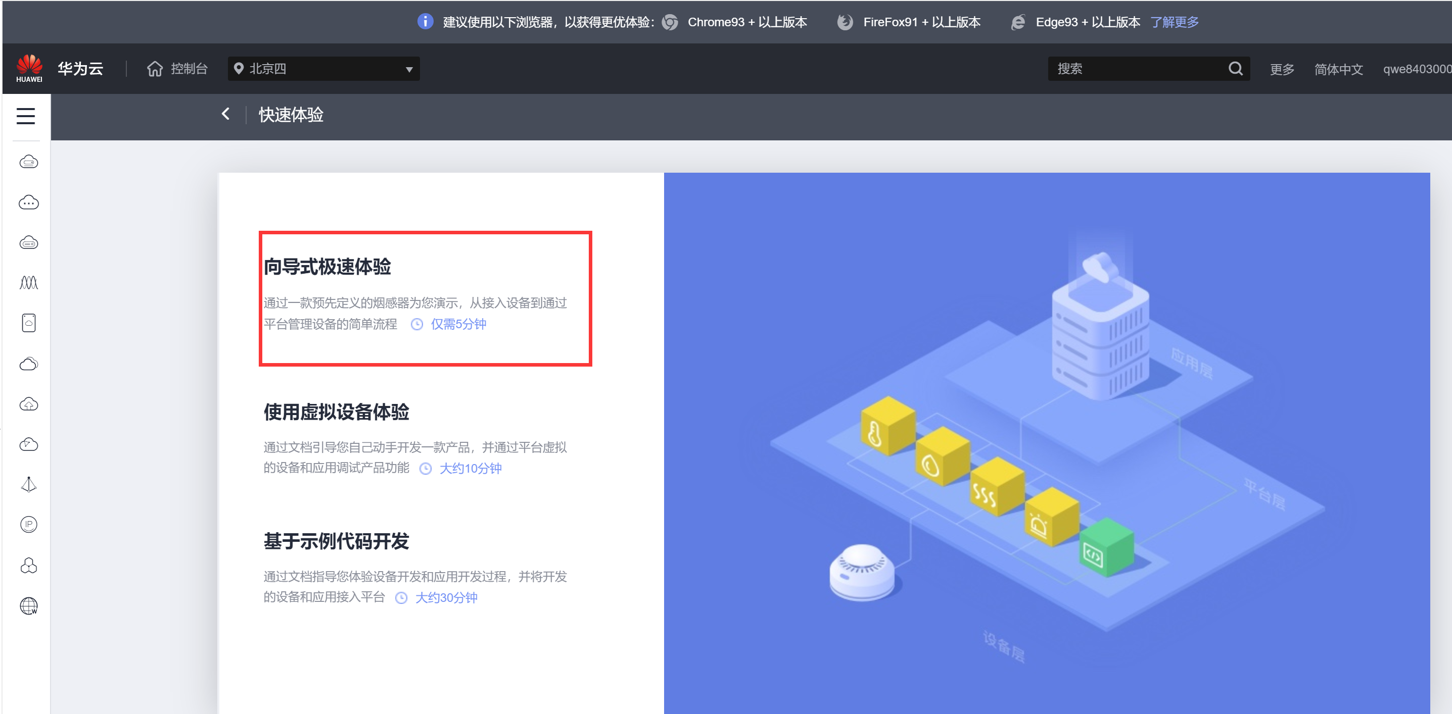 点击 华为云IoT向导式快速体验 下图选择“向导式快速体验”