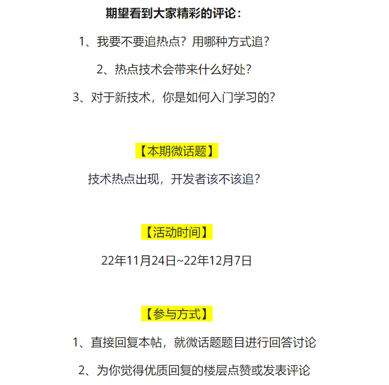 最后,我奉上为话题的官方链接,大家如果感兴趣的就快来一起讨论吧:【华为云·微话题(第58期)】技术热点出现,开发者该不该追?探讨看法领好礼~