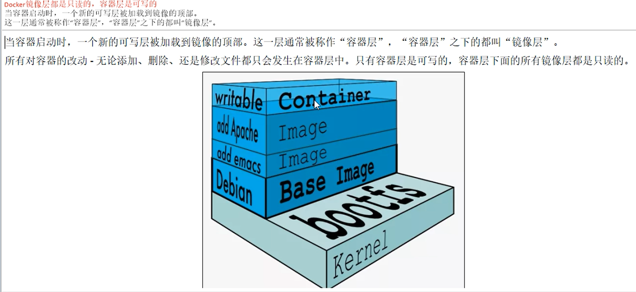 Docker镜像层都是只读的,容器层是可写的。当容器启动时,一个新的可写层被加载到镜像的顶部。这一层通常被称作容器层,容器层之下的都是镜像层。