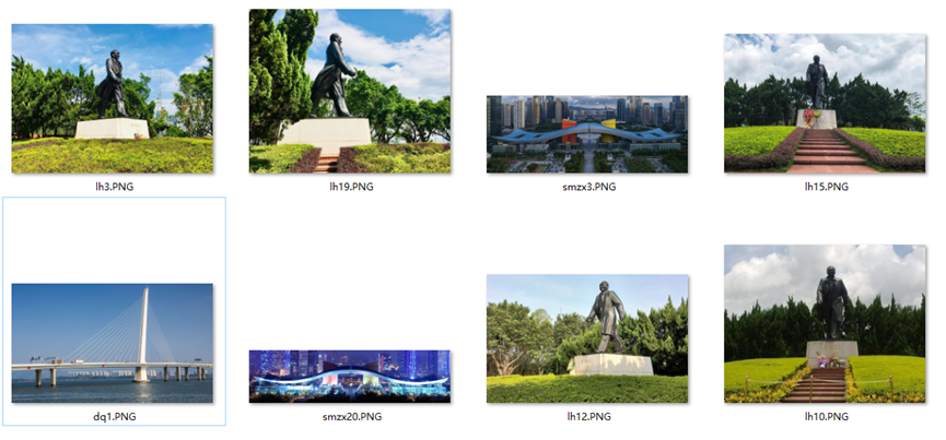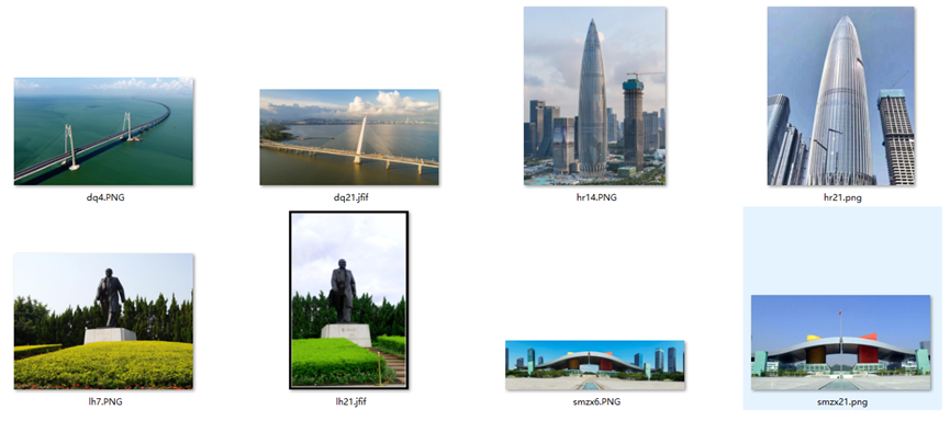 步骤2 train表示训练数据集,包含四种深圳市地标,分别是“深圳市民中心”、“深圳湾大桥”、“华润大厦”和“莲花山邓小平雕像”,每类包含20张图片,如下图所示。