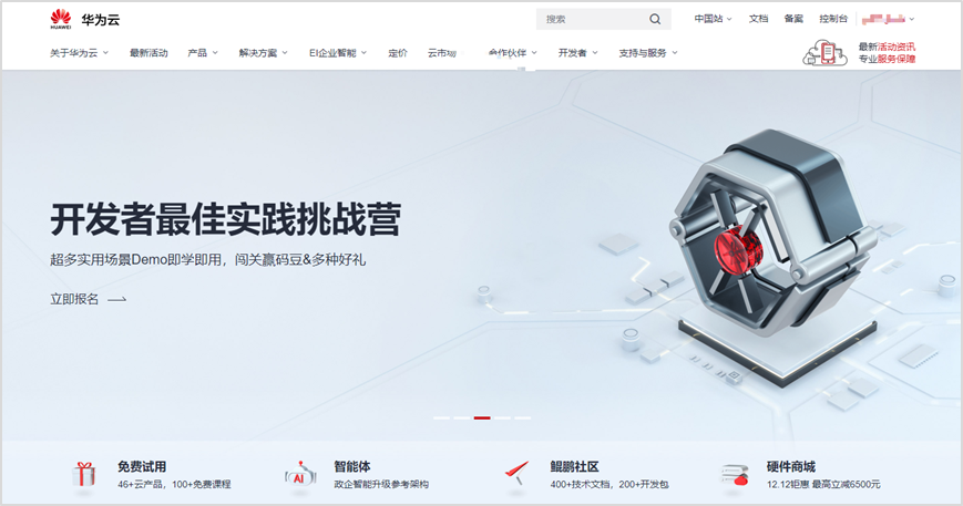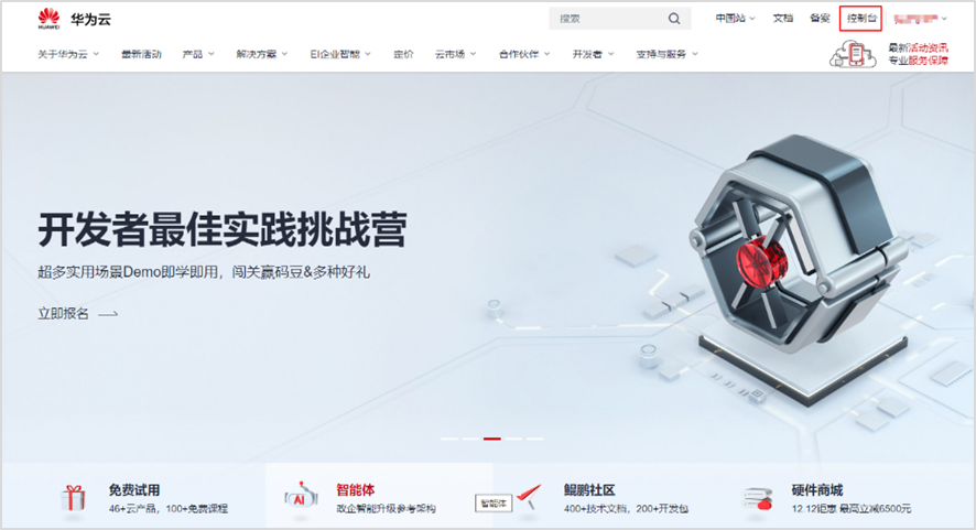 步骤1 登录华为云官网,参考链接如下: https://www.huaweicloud.cn/?locale=zh-cn。