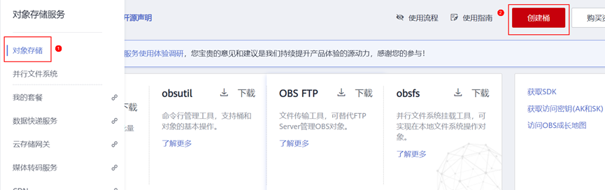 步骤4 点击OBS控制台页面的“创建桶”按钮。