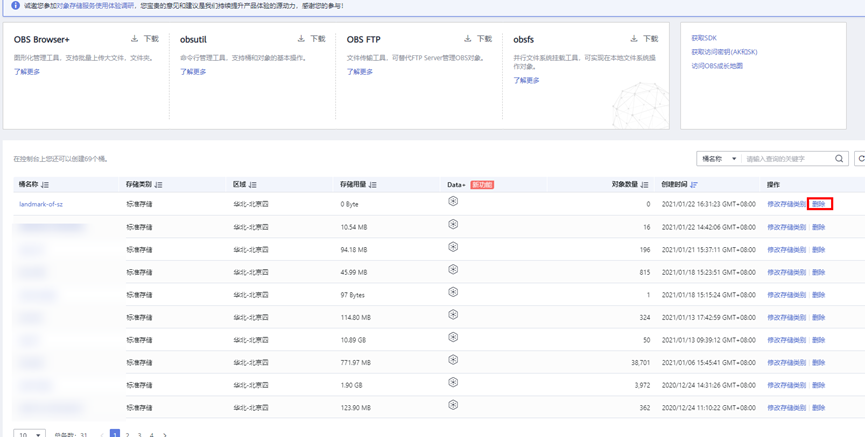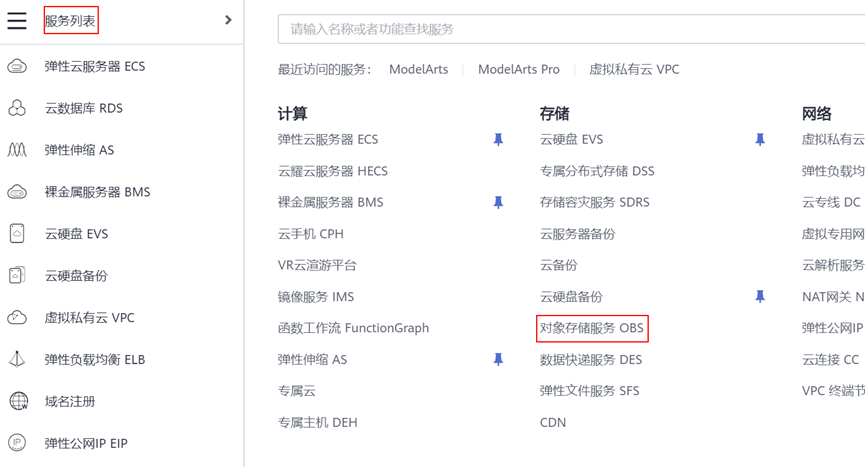 步骤1 鼠标移动到左上角“服务列表”,选择“对象存储服务OBS”进入对象存储服务控制台。