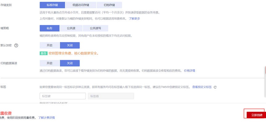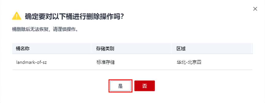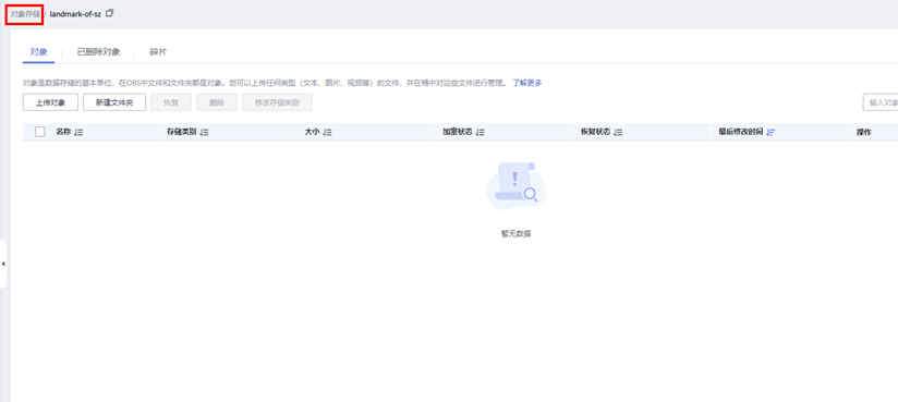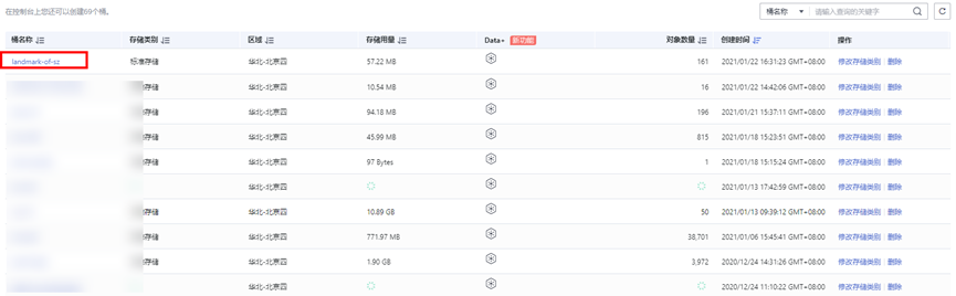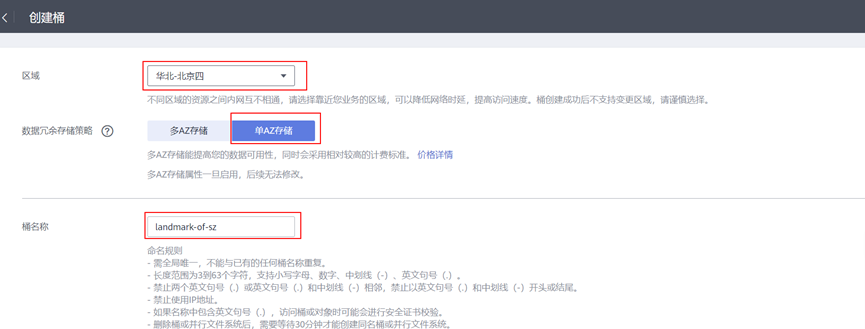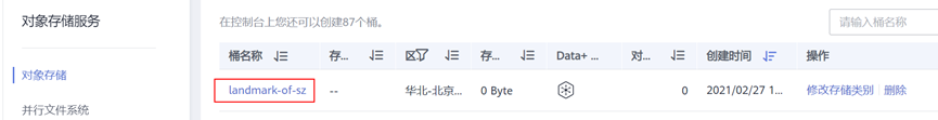 步骤5 在创建桶页面,区域选择建桶”-北京四”,桶名称请自定义填写,确保桶名称在华为云上全局唯一(本实验创建的桶名称为建landmark-of-sz”,下文中所有需要填写桶名的地方,请替换为您自己创建的桶名),其它参数保持默认值即可。接着点击右下角的即可landmark-of-sz