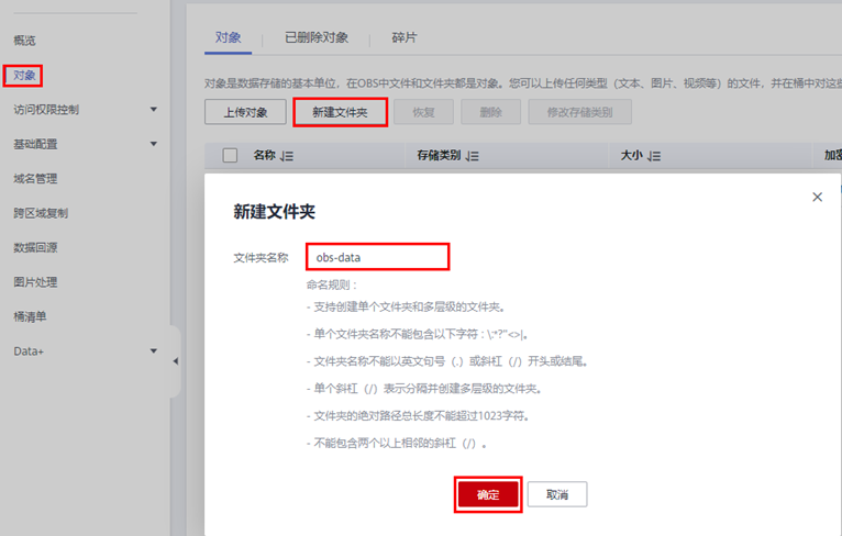 步骤7 进入桶页面,依次左侧“对象->新建文件夹”,在弹出对话框中按照命名规则填写“文件夹名称”,如“obs-data”(文件夹名称无需考虑华为云全局唯一,该文件夹稍后将用于存放数据集),再点击“确定”按钮即可完成文件夹创建。