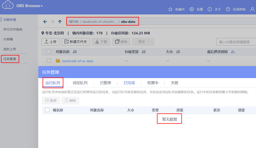 步骤12选中前面1.5节步骤1中解压后的landmark-of-sz-data文件夹,添加并上传,上传时间约几分钟,您可以选择左侧的“任务管理”,在“运行队列”中即可看见运行中的文件信息,当运行队列显示暂无数据,说明数据集文件已经上传成功。