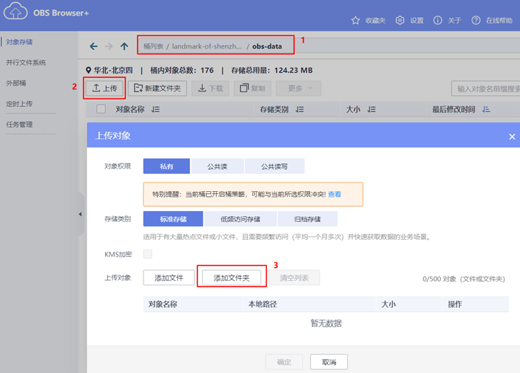 步骤11在打开的客户端中,进入到之前创建的“landmark-of-sz”桶,点击进入创建的obs-data文件夹,点击“上传 –> 添加文件夹“。
