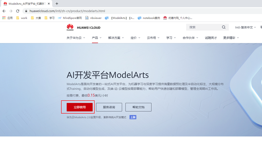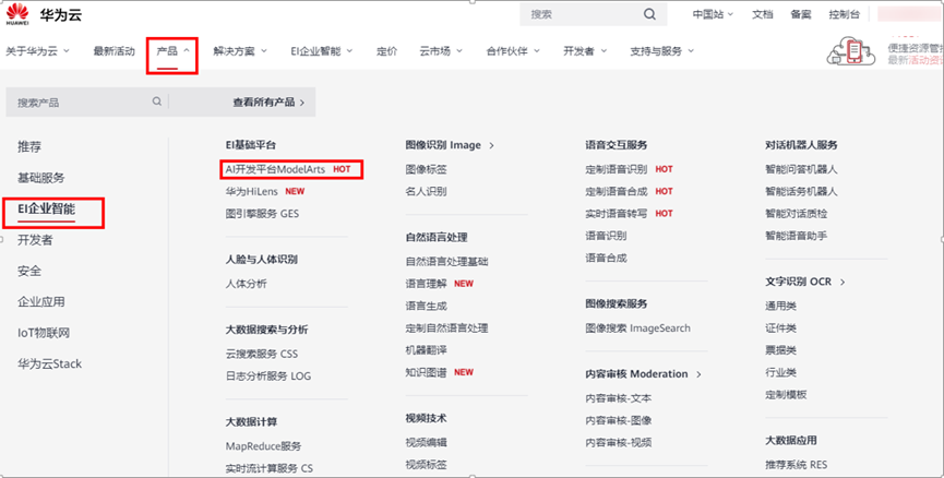 步骤1 回到华为云官网首页 ,参考链接如下:https://www.huaweicloud.cn/?locale=zh-cn,把鼠标依次移到“产品 -> EI企业智能 -> AI开发平台ModelArts”,点击“AI开发平台ModelArts”进入到ModelArts主页。