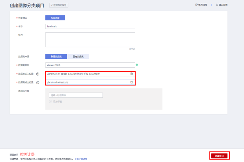 步骤5 “数据集输入位置”设置为:obs://landmark-of-sz/obs-data/landmark-of-sz-data/train,“数据集输出位置”设置为:obs://landmark-of-sz/out,设置完成后,如下图所示,然后点击“创建项目”。