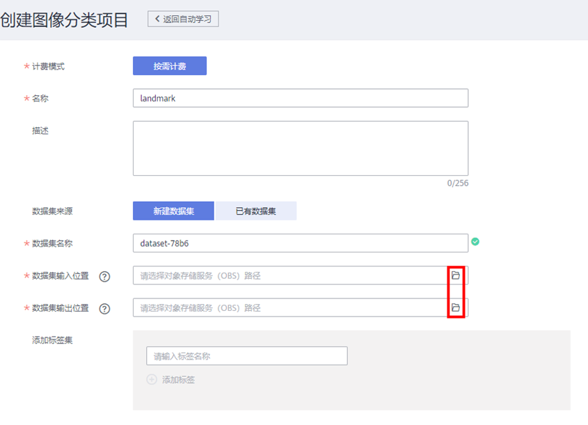 步骤4 输入自定义项目名称,如landmark,选择“新建数据集”,数据集名称已经自动生成,您可以根据需要修改名称。再依次点击“数据集输入位置”和“数据集输出位置”右侧的文件夹图标,如下图所示。