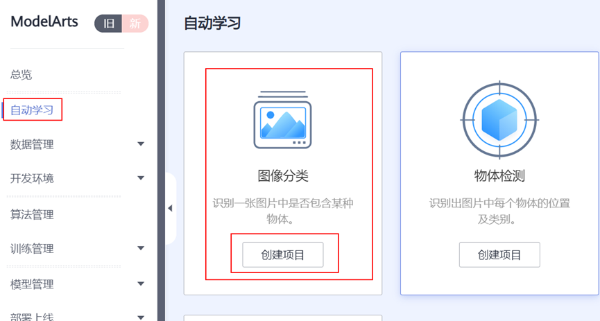 步骤3 确保左上角的ModelArts区域为 “北京四”(如果不是“北京四”,则点击该位置的三角下拉列表,选择“华北-北京四” ),再点击ModelArts控制台页面左侧菜单的“自动学习”,点击自动学习-图像分类下的“创建项目”按钮创建实验项目。