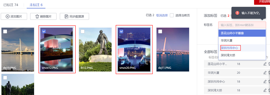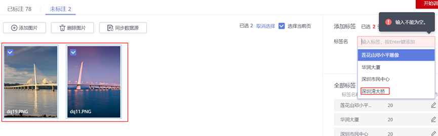 勾选深圳湾大桥的图片,然后在右侧的标签名中输入“深圳湾大桥”