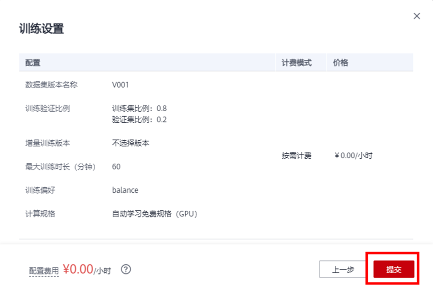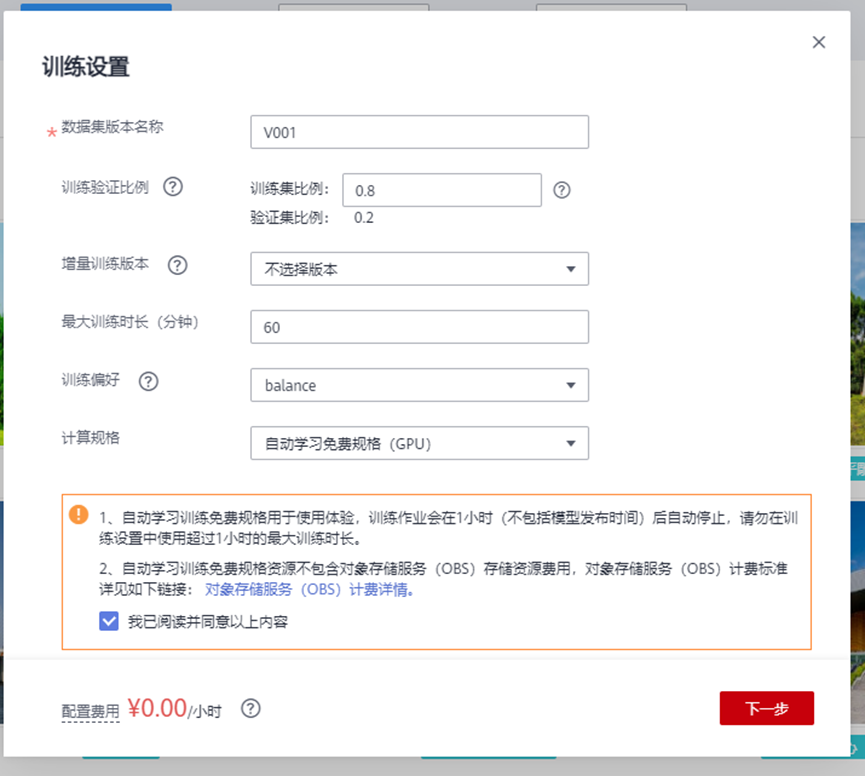 步骤1 将所有数据标注完成,点击页面的“开始训练”->“下一步”->“提交”即可开始自动训练。计算规格有“自动学习免费规格(GPU)”和“增强计算型1实例-自动学习(GPU)”可选,前者属于免费规格,后者属于收费规格,选择免费规格可能会有资源排队情况,如遇排队,可选择继续等待,也可改成使用收费规格,本实验选择“自动学习免费规格(GPU)”。