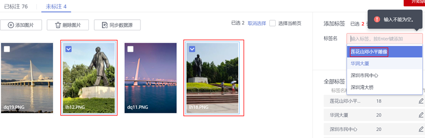 勾选莲花山邓小平雕像的图片,然后在右侧的标签名中输入“莲花山邓小平雕像”