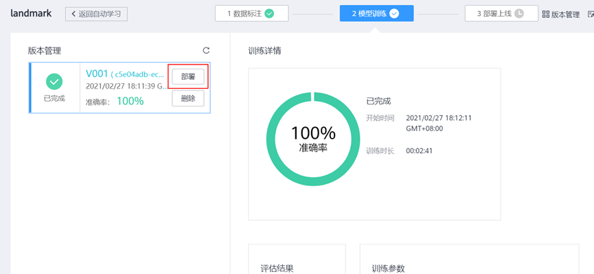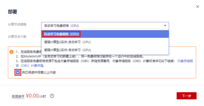 步骤2 训练完成后,点击“部署”,计算节点规格有三种可选,如下图所示,“自动学习免费规格(CPU)”是免费规格,选择它有可能出现资源排队情况,如遇排队,可选择继续等待,也可改成使用收费规格,“增强计算型3实例-自动学习(CPU)”是收费的CPU规格,“增强计算型2实例-自动学习(GPU)”是收费的GPU规格,比CPU规格更快但收费也更贵。本实验选择“自动学习免费规格(CPU)”,然后勾选“我已阅读并同意以上内容”,点击“下一步”à“提交”按钮即可部署得到一个在线服务,部署耗时约2分钟。