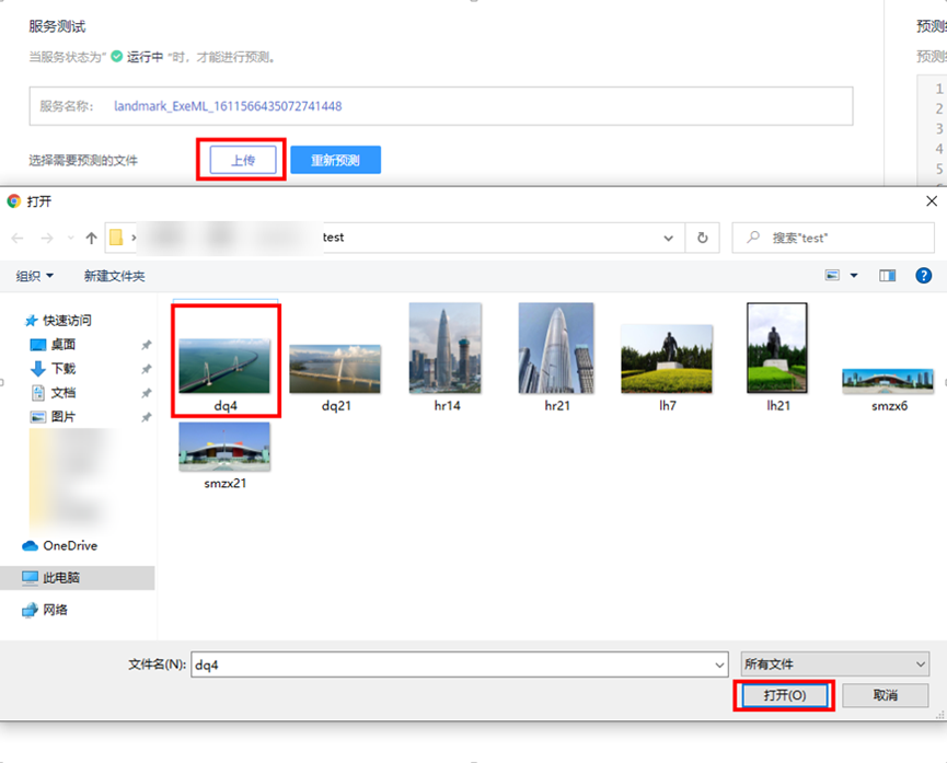 步骤3 等待服务状态变成“运行中”,点击“上传”按钮,上传3.4节下载的数据集中test目录下的图片,“打开”。