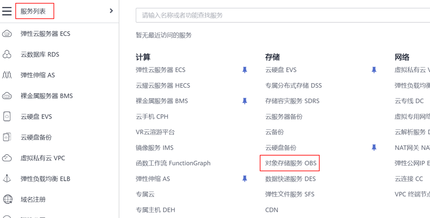 步骤3 在服务列表种选择“对象存储服务”,进入OBS控制台页面。