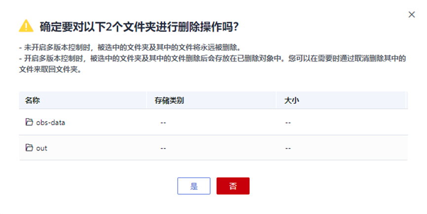 步骤8 仍然在桶页面,再次点击“新建文件夹”,在弹出对话框中按照命名规则填写“文件夹名称”,如“out” (文件夹名称无需考虑华为云全局唯一,该文件夹将作为第2节自动学习项目的数据集输出位置,下文会提到),再点击“确定”按钮即可完成文件夹创建。