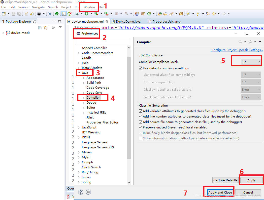 步骤1:Window —> Preferences —> Java —> Compiler —> 右侧面板设置为1.7