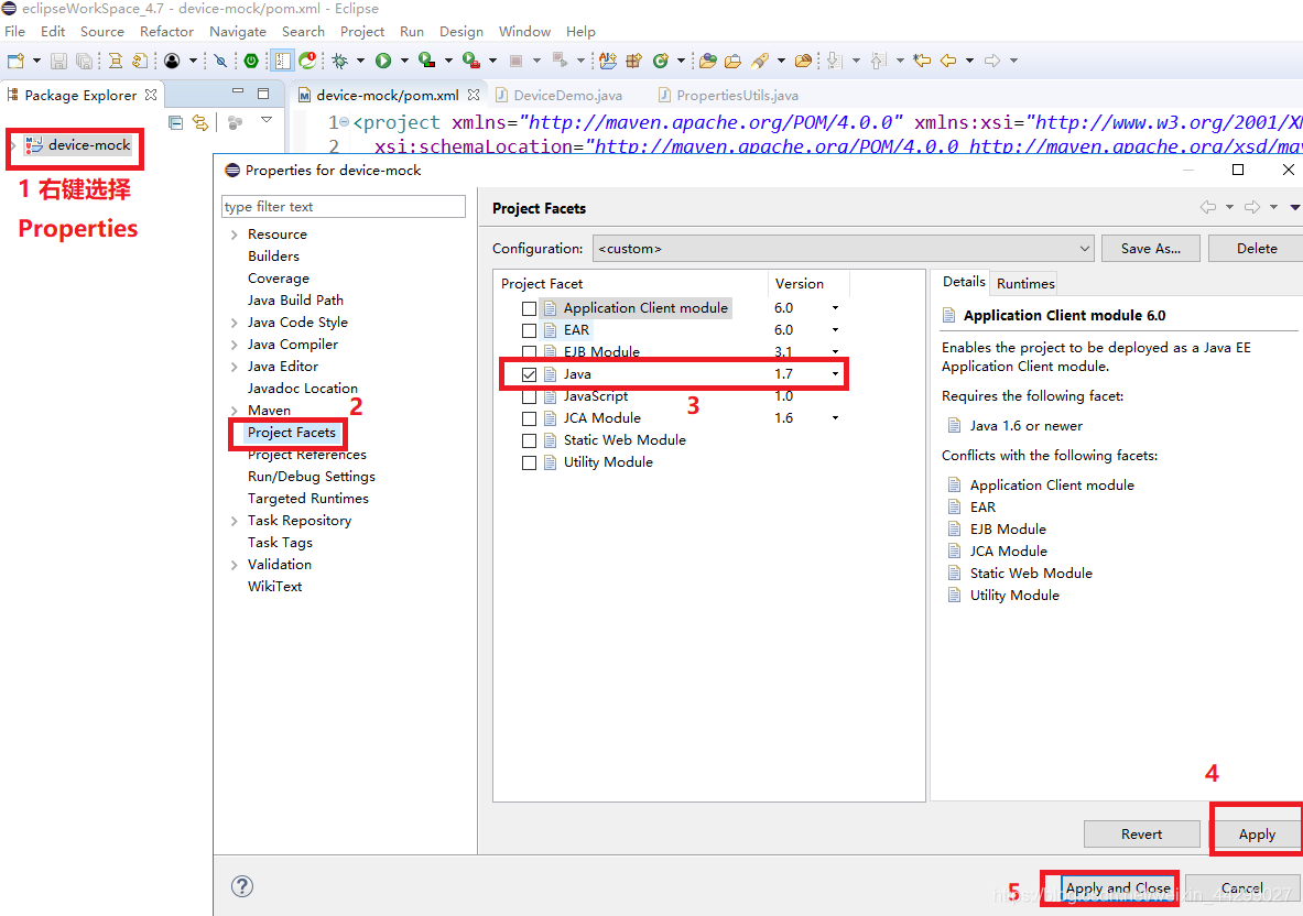 步骤5:与Java Compiler同页面的Project Facets—右侧面板勾上Java,Version设为1.7