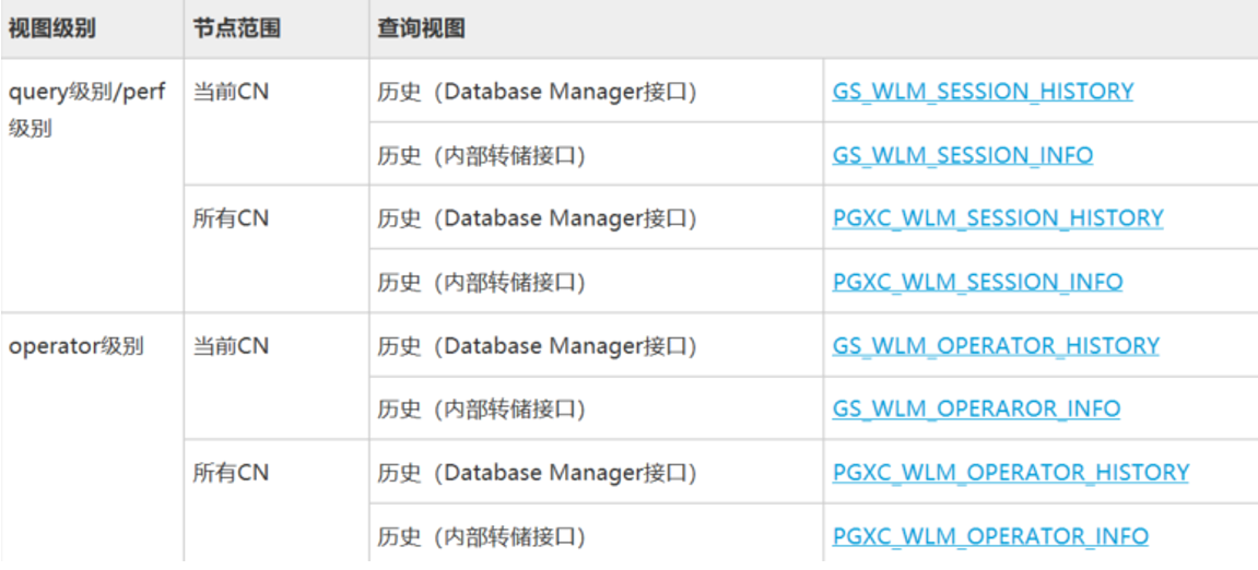 1)gs_wlm_session_history:当前用户在当前CN上执行作业结束后的负载管理记录。
