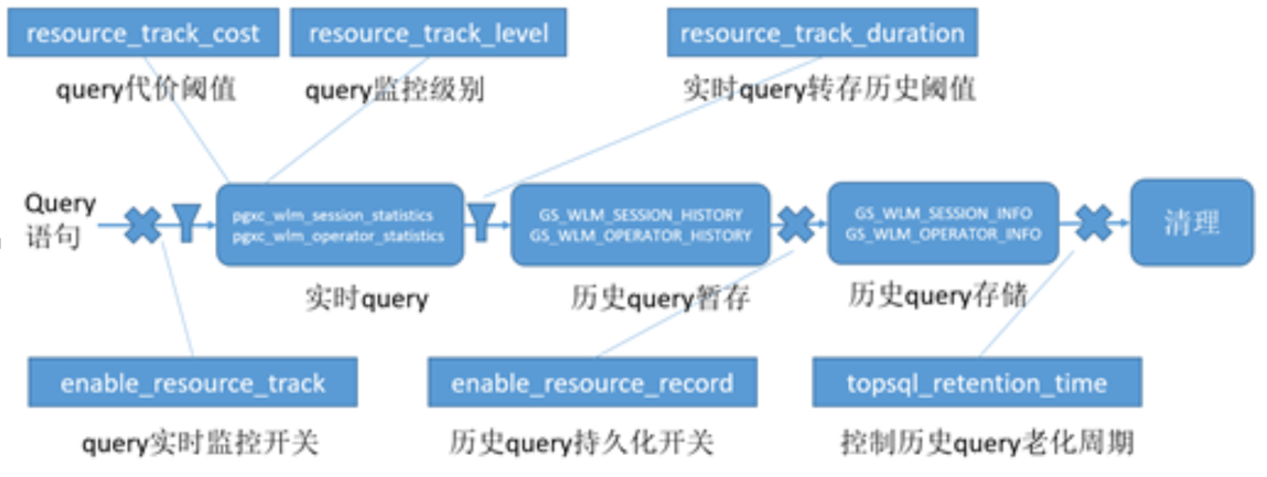 如图1所示,在设置enable_resource_track为on,resource_track_level为query的时候,当该SQL的执行代价大于设定的resource_track_cost的时候,就可以在实时TopSQL中查到相应的SQL执行信息,当该SQL执行结束之后对于其执行时间大于resource_track_duration的SQL即可以在历史TopSQL中查询到。在设置enable_resource_record为on的时候,每过三分钟会将gs_wlm_session_history中的数据落盘存到gs_wlm_session_info中。对于存入到gs_wlm_session_info中的数据可以通过设定topsql_rentention_time对其中的数据进行老化处理。