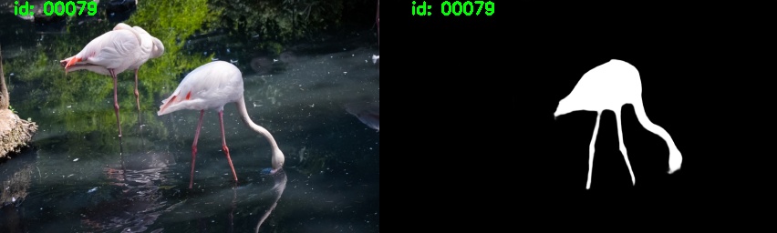 执行下面这段代码将看到视频抠图的结果,左侧视频是原视频,右侧视频是去除了一只火烈鸟目标之后的视频,可以看到目标抠除的效果是非常好的,完全不影响背景,仿佛这个目标在视频中就从来没有出现过一样。