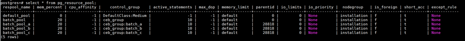 - -G:子控制组,在pg_resource_pool视图中,control_group列中带冒号(:)的后半部分,上图中为batch_a,batch_b,batch_c