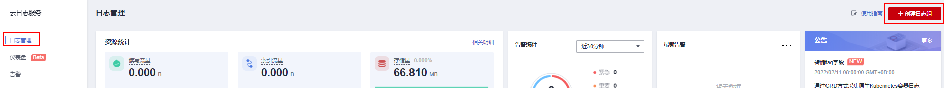 首先,我们创建一个日志组,日志组(LogGroup)是云日志服务进行日志管理的基本单位,可以创建日志流以及设置日志存储时间。进入云日志服务管理控制台 ,“日志管理”页面中,单击“创建日志组”。日志组名字根据规则自定义,日志保存时间默认是7天。