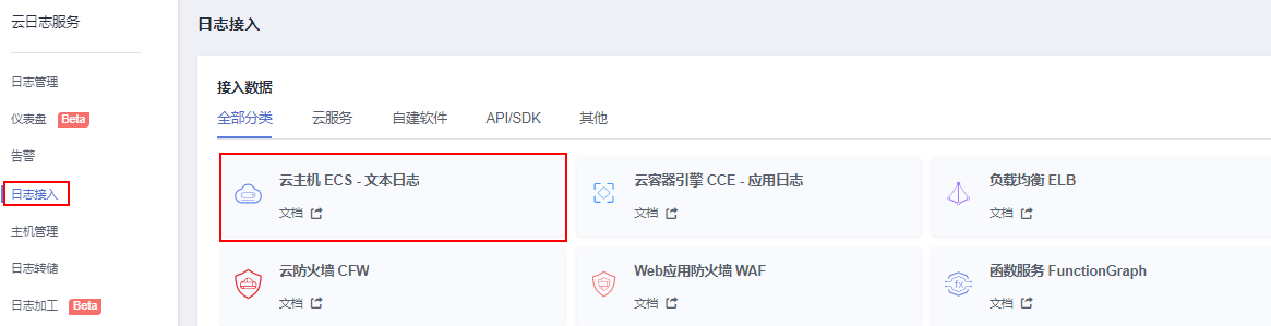 首先,在云日志服务管理控制台 ,“日志接入”页面中,选择“云主机ECS-文本日志”。
