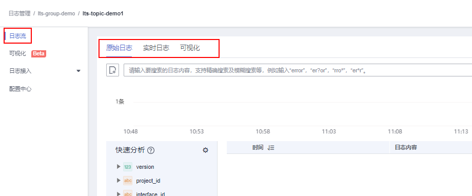 首先,在云日志服务管理控制台 ,“日志管理”页面中,选择刚刚创建好的日志组的日志流的名称,进入到日志流详情页面即可进行各种操作。