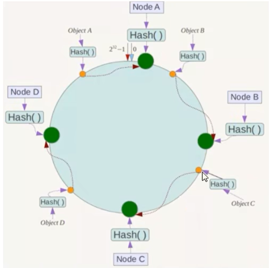 目的:为了在节点数目发生改变时尽可能少迁移数据。将所有的存储节点排列在相接的hash环上,每个key在计算hash之后,会按照顺时针找到的存储节点存放。而当有节点加入或者退出时候,仅影响该节点在hash环上的顺时针相邻的后续节点。