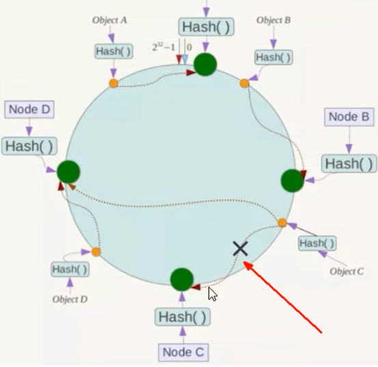 根据一致性hash算法,ObjA的数据将会被定位到NodeA上。其他的类推,B将会在NodeB上,C将会在NodeC上,D将会在NodeD上.