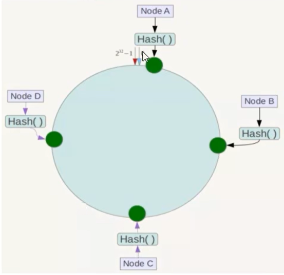 将集群中的各个IP节点映射到环上的某一个位置。将各个服务器使用hash进行一个hash.(具体可以选择服务器的IP或者主机名称作为关键字进行哈希,这样每台机器就能确定其在哈希环上的位置)。例如4个节点NodeA、B、C、D,经过IP地址的哈希环上计算(hash(ip)),使用IP地址哈希后环空间位置如下图: