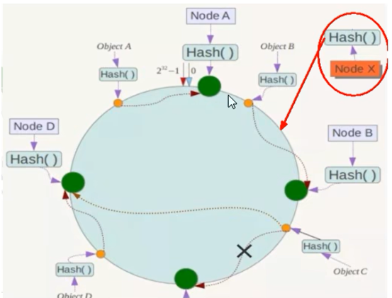 所谓的扩展性,就是数据量增加了,则需要增加一台节点NodeX,X的位置在A和B之间,那受到影响的也就是A到X之间的数据,重新把A到X的数据录入到X上即可,不会导致hash重新取余,全部数据重新洗牌.如下图: