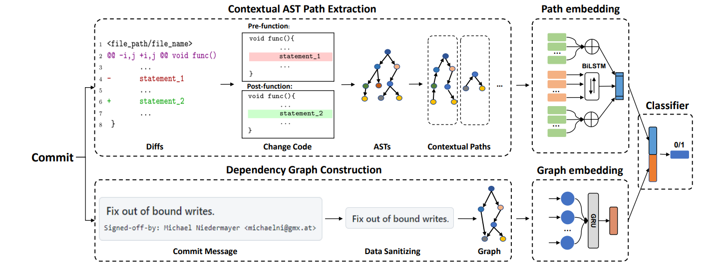 E-SPI整体的架构入上图所示,该方案分别对代码提交中的代码修改以及提交信息进行Embedding,最终联合两者的特征,来识别安全补丁。