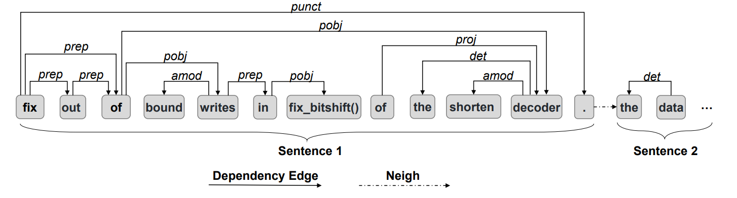 提交信息编码器:对于代码提交中的提交信息,该方案将原始的自言语言进行Dependency Graph解析,从而获取自言语言的依赖关系,针对该图结构,使用Gated Graph Neural Network完成编码。