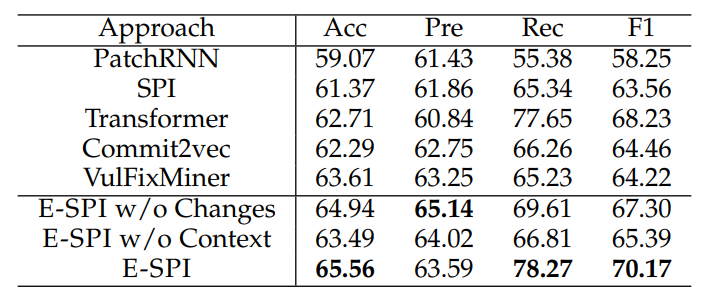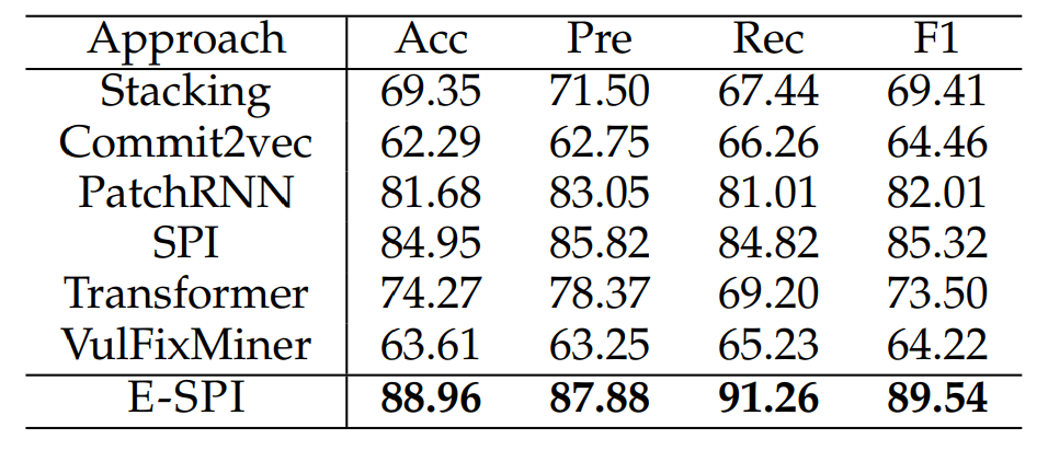 TDSC 2022发表了安全补丁识别最新的方案“Enhancing Security Patch Identification by Capturing Structures in Commits” (E-SPI),该方案同时考虑代码提交的Message和Changed Code的拓扑特征,通过实验表明,该方案超过了当前业界的SOTA,达到业界领先。