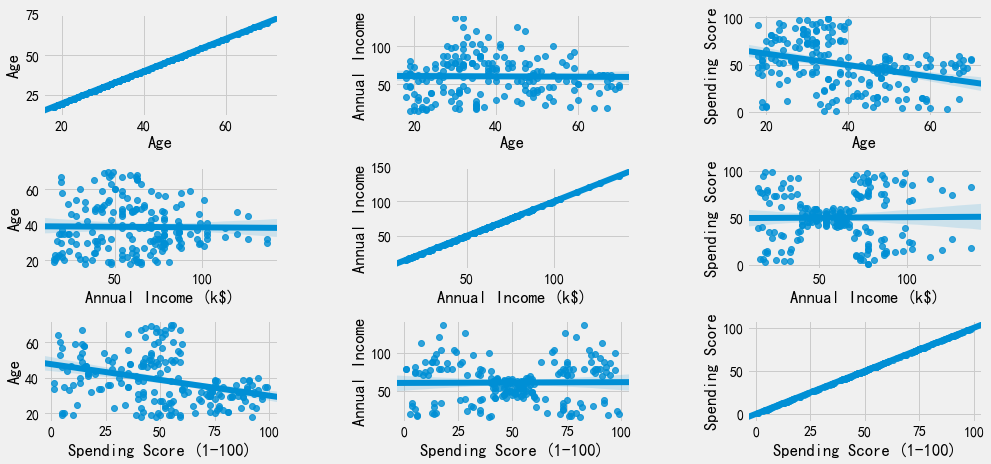 此段代码执行后,会有9张统计图,展示了任意两个属性之间的统计关系。