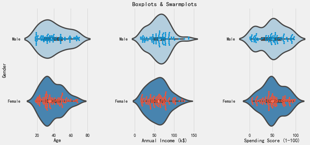 观察不同性别的客户的数据,在年龄、年收入、消费指数上的分布。